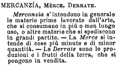 | Mercanzia, Merce, Merceria, Derrata - Mercanzia significa in genere ogni sorta di roba vendibile, ma considerata in grande, e in certa più che discreta quantità: il grano, i cuoi, i ferri, le sete, i panni ecc. sono mercanzie. Merci direi più specialmente ai panni e ad ogni genere di stoffa o altro che sta nella bottega del mercante ben ordinata e disposta. Mercerie sono que' piccoli oggetti che vende il merciaiuolo, come aghi, spille, refe, seta, cotone, bottoni, calze e simili. Derrate, propriamente le produzioni della terra; ogni specie di biade, vino, frutta, fieno ecc. [immagine] |