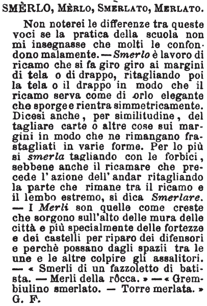 | Smerlo, Merlo, Smerlato, Merlato - Non noterei le differenze tra queste voci se la pratica della scuola non mi insegnasse che molti le confondono malamente. - Smerlo è lavoro di ricamo che si fa giro giro ai margini di tela o di drappo, ritagliando poi la tela o il drappo in modo che il ricamo serva come di orlo elegante che sporge e rientra simmetricamente. Dicesi anche, per similitudine, del tagliare carte o altre cose sui margini in modo che ne rimangano frastagliati in varie forme. Per lo più si smerla tagliando con le forbici, sebbene anche il ricamare che precede l’azione dell’andar ritagliando la parte che rimane tra il ricamo e il lembo estremo, si dica Smerlare. – I Merli son quelle come creste che sorgono sull’alto delle mura delle città e più specialmente delle fortezze e dei castelli per riparo dei difensori e perché possano dagli spazii tra le une e le altre colpire gli assalitori. - « Smerli di un fazzoletto di batista. – Merli della rôcca. » - « Grembiulino smerlato. – Torre merlata. » G.F. [immagine] |