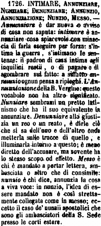 | Intimare, Annunziare, Nunziare, Denunziare; Annunzio, Annunziazione; Nunzio, Messo - Annunziare è dar nuova o avviso di cosa non saputa: intimare è annunziare cosa spiacevole con minaccia di farla eseguire per forza: s'intima la guerra, s'intimano le sentenze: il padron di casa intima agli inquilini restii, o di pagare o di sgombrare sul fatto: a siffatto annunzio ognun pensa a ripieghi. L'Annunziazione della B. Vergine: questo vocabolo non ha altro significato. Nunziare sembrami un pretto latinismo che ha il suo equivalente in annunziare. Denunziare alla giustizia un reo o un reato, è dirle ciò che si sa dell'uno e dell'altro onde metterla sulle tracce di quello, e illuminarla intorno a questo; è meno diretto dell'accusare, ma sovente ha lo stesso scopo od effetto. Messo è chi è mandato a portar lettera, ambasciata o altro che di consimile: nunzio è chi dice, annunzia la cosa a viva voce: in nunzio, l'idea di essere mandato non è così strettamente collegata come in messo; eccetto il caso de' nunzii apostolici che sono gli ambasciatori della S. Sede presso le corti estere. [immagine] |