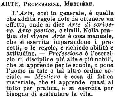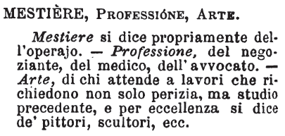 Mestiere, Professione, Arte - Mestiere si dice propriamente dell'operajo. - Professione, del negoziante, del medico, dell'avvocato. - Arte, di chi attende a lavori che richiedono non solo perizia, ma studio precedente, e per eccellenza si dice de' pittori, scultori, ecc. [immagine]