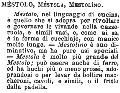 Mestolo, Mestola, Mestolino - Mestolo, nel linguaggio di cucina, è quello che si adopra per rivoltare e governare le vivande nella cazzeruola, e simili vasi, e, come si sa, è in forma di cucchiajo, con manico molto lungo. - Mestolino è suo diminutivo, ma ha pure usi speciali. - Mestola è molto più grande del Mestolo; può essere anche di ferro, ed ha buchi più o meno grossi, adoprandosi o per levar da bollire maccheroni, cavoli, e simili, o il fritto dalla padella. [immagine]