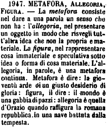 Metafora, Allegoria, Figura - La metafora consiste nel dare a una parola un senso che non ha: l'allegoria, nel presentare un oggetto in modo che risvegli tutt'altra idea che non la propria e materiale. La figura, nel rappresentare cosa immateriale e speculativa sotto idea o forma di cosa materiale. L'allegoria, in parole, è una metafora continua. Metafora è dire: la gioventù arde di un giusto desiderio di gloria: figura, il dire: il mondo è una gabbia di pazzi: allegoria è quella d'Orazio quando raffigura la romana repubblica in una nave battuta dalla tempesta. [immagine]