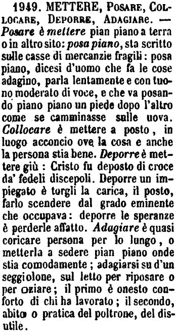 Mettere, Posare, Collocare, Deporre, Adagiare - Posare è mettere pian piano a terra o in altro sito: posa piano, sta scritto sulle casse di mercanzie fragili: posa piano, dicesi d'uomo che fa le cose adagino, parla lentamente e con tuono moderato di voce, e che va posando piano piano un piede dopo l'altro come se camminasse sulle uova. Collocare è mettere a posto, in luogo acconcio ove la cosa e anche la persona stia bene. Deporre è mettere giù: Cristo fu deposto di croce da' fedeli discepoli. Deporre un impiegato è torgli la carica, il posto, farlo scendere dal grado eminente che occupava: deporre le speranze è perderle affatto. Adagiare è quasi coricare persona per lo lungo, o metterla a sedere pian piano onde stia comodamente; adagiarsi su d'un seggiolone, sul letto per riposare o per oziare; il primo è onesto conforto di chi ha lavorato; il secondo, abito o pratica del poltrone, del disutile. [immagine]