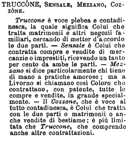 Truccone, Sensale, Mezzano, Cozzone - Truccone è voce plebea e contadinesca, la quale significa Colui che tratta matrimonii e altri negozii familiari, cercando di metter d'accordo le due parti. - Sensale è Colui che contratta compre e vendite di mercanzie o imprestiti, ricevendo un tanto per cento da ambe le parti. - Mezzano si dice particolarmente chi tiene di mano a pratiche amorose; ma a Livorno si chiamano così Coloro che contrattano, con patente, tutte le compre e vendite, in grande specialmente. - Il Cozzone, che è voce al tutto contadinesca, è Colui che tratta con le due parti o matrimonii o anche vendite di bestiame; è più limitata che Truccone, che comprende anche altre contrattazioni. [immagine]