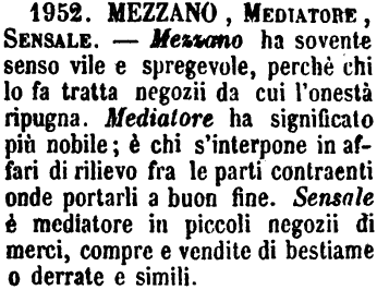 Mezzano, Mediatore, Sensale - Mezzano ha sovente senso vile e spregevole, perchè chi lo fa tratta negozii da cui l'onestà ripugna. Mediatore ha significato più nobile; è chi s'interpone in affari di rilievo fra le parti contraenti onde portarli a buon fine. Sensale è mediatore in piccoli negozii di merci, compre e vendite di bestiame o derrate e simili. [immagine]
