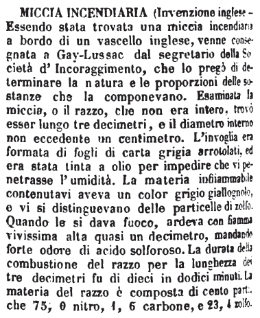 | Miccia Incendiaria - (Invenzione inglese - Essendo stata trovata una miccia incendiaria a bordo di un vascello inglese, venne consegnata a Gay-Lussac dal segretario della Società d'Incoraggiamento, che lo pregò di determinare la natura e le proporzioni delle sostanze che la componevano. Esaminata la miccia, o il razzo, che non era intero, trovò esser lungo tre decimetri, e il diametro interno non eccedente un centimetro. L'invoglia era formata di fogli di carta grigia arrotolati, ed era stata tinta a olio per impedire che vi penetrasse l'umidità. La materia infiammabile contenutavi aveva un color grigio giallognolo, e vi si distinguevano delle particelle di zolfo. Quando le si dava fuoco, ardeva con fiamma vivissima alta quasi un decimetro, mandando forte odore di acido solforoso. La durata della combustione del razzo per la lunghezza dei tre decimetri fu di dieci in dodici minuti. La materia del razzo è composta di cento parti, che 75,0 nitro, 1,6 carbone, e 23,4 zolfo. [immagine] |