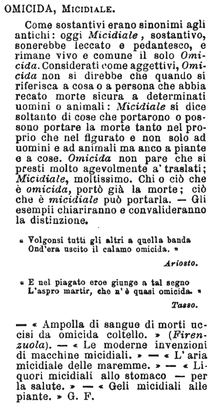 Omicida, Micidiale - Come sostantivi erano sinonimi agli antichi: oggi Micidiale, sostantivo, sonerebbe leccato e pedantesco, e rimane vivo e comune il solo Omicida. Considerati come aggettivi, Omicida non si direbbe che quando si riferisca a cosa o a persona che abbia recato morte sicura a determinati uomini o animali: Micidiale si dice soltanto di cose che portarono o possono portare la morte tanto nel proprio che nel figurato e non solo ad uomini e ad animali ma anco a piante e a cose. Omicida non pare che si presti molto agevolmente a' traslati; Micidiale, moltissimo. Chi o ciò che è omicida, portò già la morte; ciò che è micidiale può portarla. - Gli esempii chiariranno e convalideranno la distinzione.