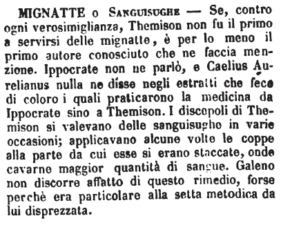| Mignatte o Sanguisughe - Se, contro ogni verosimiglianza, Themison non fu il primo a servirsi delle mignatte, è per lo meno il primo autore conosciuto che ne faccia menzione. Ippocrate non ne parlò, e Caelius Aurelianus nulla ne disse negli estratti che fece di coloro i quali praticarono la medicina da Ippocrate sino a Themison. I discepoli di Themison si valevano delle sanguisughe in varie occasioni; applicavano alcune volte le coppe alla parte da cui esse si erano staccate, onde cavarne maggior quantità di sangue. Galeno non discorre affatto di questo rimedio, forse perchè era particolare alla setta metodica da lui disprezzata. [immagine] |