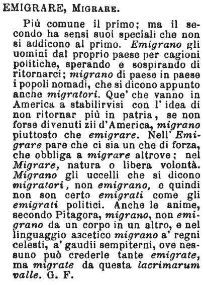 | Emigrare, Migrare - Più comune il primo; ma il secondo ha sensi suoi speciali che non si addicono al primo. Emigrano gli uomini dal proprio paese per cagioni politiche, sperando e sospirando di ritornarci; migrano di paese in paese i popoli nomadi, che si dicono appunto anche migratori. Que' che vanno in America a stabilirvisi con l'idea di non ritornar più in patria, se non forse divenuti zii d'America, migrano piuttosto che emigrare. Nell'Emigrare pare che ci sia un che di forza, che obbliga a migrare altrove; nel Migrare, natura o libera volontà. Migrano gli uccelli che si dicono migratori, non emigrano, e quindi non sono certo emigrati come gli emigrati politici. Anche le anime, secondo Pitagora, migrano, non emigrano da un corpo in un altro, e nel linguaggio ascetico migrano a' regni celesti, a' gaudii sempiterni, ove nessuno può crederle tante emigrate, ma migrate da questa lacrimarum valle. G. F. [immagine] |