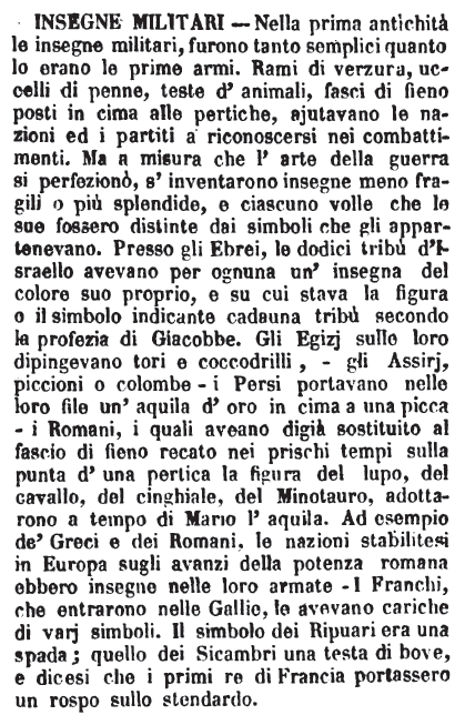 | Insegne militari - Nella prima antichità le insegne militari, furono tanto semplici quanto lo erano le prime armi. Rami di verzura, uccelli di penne, teste d'animali, fasci di fieno posti in cima alle pertiche, ajutavano le nazioni ed i partiti a riconoscersi nei combattimenti. Ma a misura che l'arte della guerra si perfezionò, s'inventarono insegne meno fragili o più splendide, e ciascuno volle che le sue fossero distinte dai simboli che gli appartenevano. Presso gli Ebrei, le dodici tribù d'Israello avevano per ognuna un'insegna del colore suo proprio, e su cui stava la figura o il simbolo indicante cadauna tribù secondo la profezia di Giacobbe. Gli Egizj sulle loro dipingevano tori e coccodrilli, - gli Assirj, piccioni o colombe - i Persi portavano nelle loro file un'aquila d'oro in cima a una picca - i Romani, i quali aveano digià sostituito al fascio di fieno recato nei prischi tempi sulla punta d'una pertica la figura del lupo, del cavallo, del cinghiale, del Minotauro, adottarono a tempo di Mario l'aquila. Ad esempio de' Greci e dei Romani, le nazioni stabilitesi in Europa sugli avanzi della potenza romana ebbero insegne nelle loro armate - I Franchi, che entrarono nelle Gallie, le avevano cariche di varj simboli. Il simbolo dei Ripuari era una spada; quello dei Sicambri una testa di bove, e dicesi che i primi re di Francia portassero un rospo sullo stendardo. [immagine] |