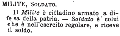 Milite, Soldato - Il Milite è cittadino armato a difesa della patria. - Soldato è colui che è nell'esercito regolare, e riceve il soldo. [immagine]