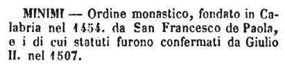 Minimi - Ordine monastico, fondato in Calabria nel 1454. da San Francesco de Paola, e i di cui statuti furono confermati da Giulio II. nel 1507. [immagine]