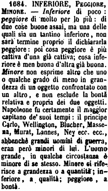 | Inferiore, Peggiore, Minore - Inferiore di poco: peggiore di molto per lo più: di due cose buone assai, ma una delle quali sia un tantino inferiore, non sarà termine proprio il dichiararla peggiore: poi cosa peggiore è più cattiva d'una già cattiva; cosa inferiore è men buona d'altra già buona. Minore non esprime altro che uno o qualche grado di meno in grandezza di un oggetto confrontato con un altro, e non esclude la bontà relativa e propria dei due oggetti. Napoleone fu certamente il maggior capitano de' suoi tempi: il principe Carlo, Wellington, Blucher, Massena, Murat, Lannes, Ney ecc. ecc., abbenchè grandi uomini di guerra, eran però minori di lui. L'uomo grande, in qualche circostanza è minore di se stesso. Minore si riferisce a grandezza o a quantità; inferiore, a qualità; peggiore, a bontà. [immagine] |