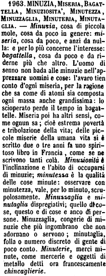 Minuzia, Miseria, Bagattella, Minuziosità, Minutezza, Minuzzaglia, Minuteria, Minutaglia - Minuzia, cosa di piccola mole, cosa da poco in genere: miseria, cosa da poco, e anzi da nulla: e per lo più concerne l'interesse: bagattella, cosa da poco e da riderne più che altro. L'uomo di senno non bada alle minuzie nell'apprezzare uomini e cose: l'avaro tien conto d'ogni miseria, per la ragione che sa come di atomi sia composta ogni massa anche grandissima: lo scioperato perde il tempo in bagattelle. Miseria poi ha altri sensi, come ognun sa; cioè estrema povertà e tribolazione della vita; delle piccole miserie della umana vita si è scritto due o tre anni fa uno spiritoso libro in Francia, come se ne scrivono tanti colà. Minuziosità è l'inclinazione e l'abito di occuparsi di minuzie; minutezza è la qualità delle cose minute: osservare con minutezza, vale, per lo minuto, scrupolosamente. Minuzzaglia e minutaglia dispregiativi; quello di cose, questo e di cose e anco di persone. Minuzzaglia, congerie di minuzie che più ingombrano che non adornano o servono; minutaglia, folla o numero discreto di gente di poco conto. Minuterie, merci minute, come mercerie e oggetti di metallo detti ora francescamente chincaglierie. [immagine]