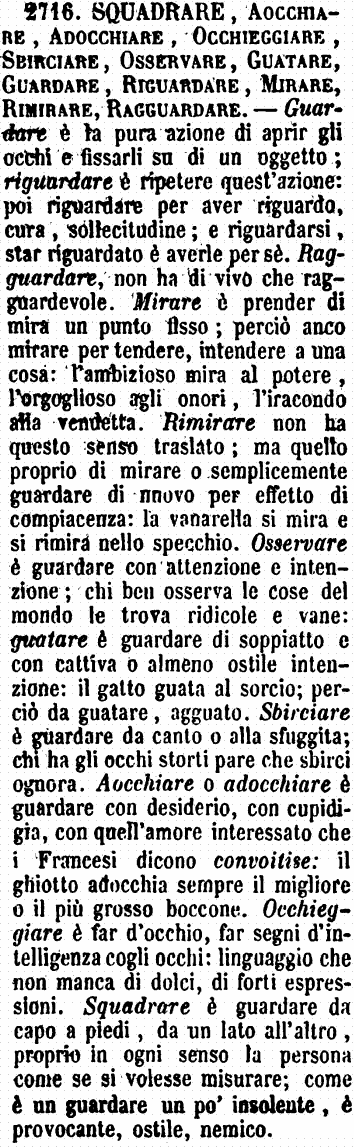 | Mirare, Guardare, Vedere, Osservare - Guardare è il puro atto del volger gli occhi verso un oggetto, per accertarsi qual esso è. - Vedere è il comprendere, per mezzo della vista, di che qualità è la cosa guardata. - Mirare è il fermarsi a considerare la cosa veduta, quasi pigliandone maraviglia. - Osservare è il fissarvisi con attenzione per conoscerne ogni particolare. [immagine] |