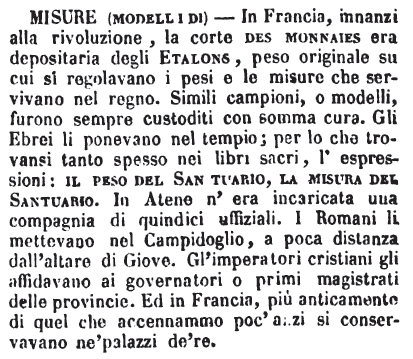 | Misure (Modelli di) - In Francia, innanzi alla rivoluzione, la corte des monnaies era depositaria degli Etalons, peso originale su cui si regolavano i pesi e le misure che servivano nel regno. Simili campioni, o modelli, furono sempre custoditi con somma cura. Gli Ebrei li ponevano nel tempio; per lo che trovansi tanto spesso nei libri sacri, l'espressioni: il peso del Santuario, la misura del Santuario. In Atene n'era incaricata una compagnia di quindici uffiziali. I Romani li mettevano nel Campidoglio, a poca distanza dall'altare di Giove. Gl'imperatori cristiani gli affidavano ai governatori o primi magistrati delle provincie. Ed in Francia, più anticamente di quel che accennammo poc'anzi si conservavano ne' palazzi de' re. [immagine] |