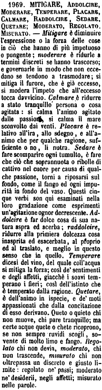 | Mitigare, Addolcire, Moderare, Temperare, Placare, Calmare, Raddolcire, Sedare, Quetare; Moderato, Regolato, Misurato - Mitigare è diminuire l'espressione o la forza delle cose in ciò che hanno di più impetuoso o pungente; moderare è ridurle a termini discreti se hanno trascorso; e governarle in modo che non eccedano se tendono a trasmodare; si mitiga il furore, che è già eccesso, si modera l'impeto che all'eccesso tocca davvicino. Calmare è ridurre a stato tranquillo persona o cosa agitata: si calma l'animo agitato dalle passioni, si calma il mare sconvolto dai venti. Placare è relativo all'ira, allo sdegno, e all'animo che per qualche ragione, sufficiente o no, li nutra. Sedare è fare scomparire ogni tumulto, è fare che ciò che soprannuota o ribolle di cattivo nel cuore per causa di qualche passione, torni a riposarsi sul fondo, come il fango ed ogni impurità in fondo del vaso. Questi cinque verbi son qui esaminati nella loro gradazione come esprimenti un'agitazione ognor decrescente. Addolcire è far dolce cosa di sua natura aspra ed acerba; raddolcire, ridurre alla primiera dolcezza cosa inasprita ed esacerbata, al proprio ed al traslato, e meglio in questo senso che in quello. Temperare dicesi del vino, del quale coll'acqua si mitiga la forza; così de' sentimenti e degli affetti, giacchè i soavi temperano i fieri; così dell'istinto che è temperato dalla ragione. Quetare, è dell'animo in ispecie, e de' moti appassionati che dalla concitazione di esso derivano. Queto o quieto chi non muove, chi pare tranquillo; ma certe acque quete o chete ricoprono, se non sempre ruvidi scogli, sovente di molto limo e fango. Regolato chi non devia, moderato, chi non trascende, misurato chi non oltrepassa un discreto e giusto limite: regolato ne' passi; moderato ne' desiderii, negli affetti; misurato nelle parole. [immagine] |