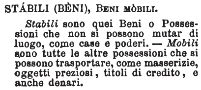 | Stabili (beni), Beni mobili - Stabili sono quei Beni o Possessioni che non si possono mutar di luogo, come case e poderi. - Mobili sono tutte le altre possessioni che si possono trasportare, come masserizie, oggetti, preziosi, titoli di credito, e anche denari. [immagine] |