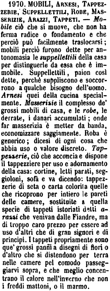 | Mobili, Arnesi, Tappezzerie, Suppellettili, Robe, Masserizie, Arazzi, Tappeti - Mobile ciò che si muove, che non ha ferma radice o fondamento e che perciò può facilmente traslocarsi; mobili perciò furono dette per antonomasia le suppellettili della casa per distinguerle da essa che è immobile. Suppellettili, paion così dette, perchè suppliscono e soccorrono a qualche bisogno dell'uomo. Arnesi quei della cucina specialmente. Masserizie il complesso de' grossi mobili di casa, e le robe, le derrate, i danari accumulati; onde far masserizia è metter da banda, economizzare saggiamente. Roba è generico; dicesi di ogni cosa che abbia uso o valore discreto. Tappezzerie, ciò che acconcia e dispone il tappezziere per uso e adornamento della casa: cortine, letti parati, seggioloni, sofà e va dicendo: tappezzerie di seta o carta colorita quelle che ricoprono per intiero le pareti delle camere, sostituite a quella specie di tappeti istoriati detti arazzi che venivan dalle Fiandre, ma di troppo caro prezzo per essere ad uso d'altri che di gran signori e di principi. I tappeti propriamente sono que' grossi panni a disegni di fiori o d'altro che si distendono per terra nelle camere pel comodo passeggiarvi sopra, e che meglio concentrano il calore nell'inverno che non i freddi mattoni, o il marmo. [immagine] |