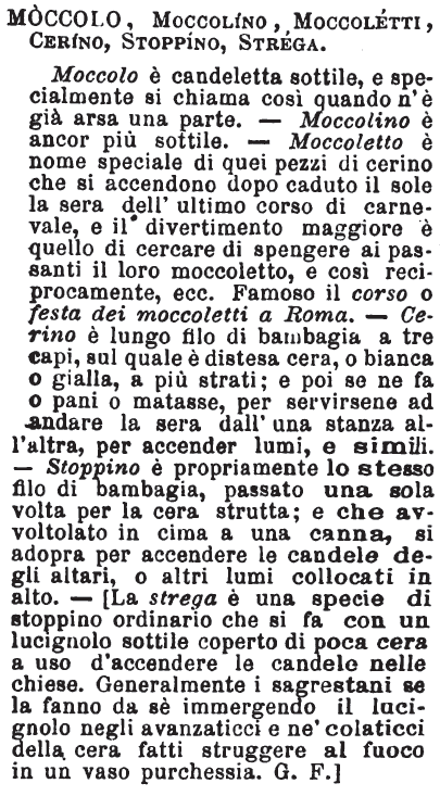 Moccolo, Moccolino, Moccoletti, Cerino, Stoppino, Strega - Moccolo è candeletta sottile, e specialmente si chiama così quando n'è già arsa una parte. - Moccolino è ancor più sottile. - Moccoletto è nome speciale di quei pezzi di cerino che si accendono dopo caduto il sole la sera dell'ultimo corso di carnevale, e il divertimento maggiore è quello di cercare di spegnere ai passanti il loro moccoletto, e così reciprocamente, ecc. Famoso il corso o festa dei moccoletti a Roma. - Cerino è lungo filo di bambagia a tre capi, sul quale è distesa cera, o bianca o gialla, a più strati; e poi se ne fa o pani o matasse, per servirsene ad andare la sera dall'una stanza all'altra, per accender lumi, e simili. - Stoppino è propriamente lo stesso filo di bambagia, passato una sola volta per la cera strutta; e che avvoltolato in cima a una canna, si adopra per accendere le candele degli altari, o altri lumi collocati in alto. - [La strega è una specie di stoppino ordinario che si fa con un lucignolo sottile coperto di poca cera a uso d'accendere le candele nelle chiese. Generalmente i sagrestani se la fanno da sè immergendo il lucignolo negli avanzaticci e ne' colaticci della cera fatti struggere al fuoco in un vaso purchessia. G. F.] [immagine]