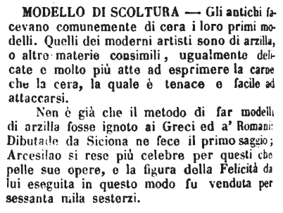 Modello di scoltura - Gli antichi facevano comunemente di cera i loro primi modelli. Quelli dei moderni artisti sono di arzilla, o altre materie consimili, ugualmente delicate e molto più atte ad esprimere la carne che la cera, la quale è tenace e facile ad attaccarsi.