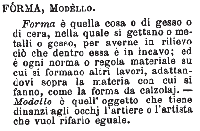 Forma, Modello - Forma è quella cosa o di gesso o di cera, nella quale si gettano o metalli o gesso, per averne in rilievo ciò che dentro essa è in incavo; ed è ogni norma o regola materiale su cui si formano altri lavori, adattandovi sopra la materia con cui si fanno, come la forma da calzolaj. - Modello è quell'oggetto che tiene dinanzi agli occhj l'artiere o l'artista che vuol rifarlo eguale. [immagine]