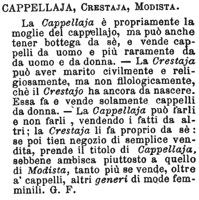 | Cappellaja, Crestaja, Modista - La Cappellaja è propriamente la moglie del cappellajo, ma può anche tener bottega da sè, e vende cappelli da uomo e più raramente da uomo e da donna. - La Crestaja può aver marito civilmente e religiosamente, ma non filologicamente, chè il Crestajo ha ancora da nascere. Essa fa e vende solamente cappelli da donna. - La Cappellaja può farli e non farli, vendendo i fatti da altri; la Crestaja li fa proprio da sè: se poi tien negozio di semplice vendita, prende il titolo di Cappellaja, sebbene ambisca piuttosto a quello di Modista, tanto più se vende, oltre a' cappelli, altri generi di mode femminili. G. F. [immagine] |
