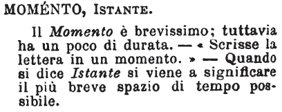 | Istante, Momento - L'istante è nel tempo ciò ch'è il punto nello spazio, l'atomo nella materia. Il momento, per breve che sia, consta di parecchi istanti: si aspetta il momento, giunge l'istante; in un momento si carica un cannone, venti, cento cannoni: in un istante vi si dà fuoco; un momento dopo si vede la strage che hanno fatta. [immagine] |