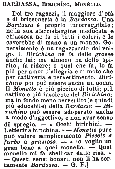 | Bardassa, Birichino, Monello - Dei tre ragazzi, il maggiore d'età e di bricconeria è la Bardassa. Una Bardassa è proprio incorreggibile; nella sua sfacciataggine ineducata e chiassosa ne fa di tutti i colori, e le caverebbe di mano a un monco. Generalmente è un ragazzaccio del volgo. Il Birichino ne fa delle grosse anche lui; ma almeno ha dello spirito, fa ridere; e quel che fa, lo fa più per amor d'allegria e di moto che per cattiveria e pervertimento. Birichino poi può essere anche un uomo. Il Monello è più piccino di tutti; più cattivo e più insolente del Birichino; ma in fondo meno pervertito (e quindi più educabile) della Bardassa. - Birichino può essere adoperato anche a modo d'aggettivo, e non aver senso di spregio. - «Occhi birichini. - Letterina birichina.» - Monello pure può valere semplicemente Piccolo e furbo o grazioso. - «Io voglio un gran bene a quel monello. - Quel monello mi fa sbellicar dalle risa.» - Questi sensi bonarii non li ha certamente Bardassa. - G. F.] [immagine] |
