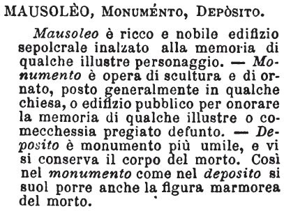 Mausoleo, Monumento, Deposito - Mausoleo è ricco e nobile edifizio sepolcrale inalzato alla memoria di qualche illustre personaggio. - Monumento è opera di scultura e di ornato, posto generalmente in qualche chiesa, o edifizio pubblico per onorare la memoria di qualche illustre o comecchessia pregiato defunto. - Deposito è monumento più umile, e vi si conserva il corpo del morto. Così nel monumento come nel deposito si suol porre anche la figura marmorea del morto. [immagine]