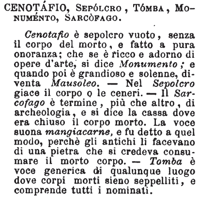 Cenotafio, Sepolcro, Tomba, Monumento, Sarcofago - Cenotafio è sepolcro vuoto, senza il corpo del morto, e fatto a pura onoranza; che se è ricco e adorno di opere d'arte, si dice Monumento; e quando poi è grandioso e solenne, diventa Mausoleo. - Nel Sepolcro giace il corpo o le ceneri. - Il Sarcofago è termine, più che altro, di archeologia, e si dice la cassa dove era chiuso il corpo morto. La voce suona mangiacarne, e fu detto a quel modo, perchè gli antichi li facevano di una pietra che si credeva consumare il morto corpo. - Tomba è voce generica di qualunque luogo dove corpi morti sieno seppelliti, e comprende tutti i nominati. [immagine]