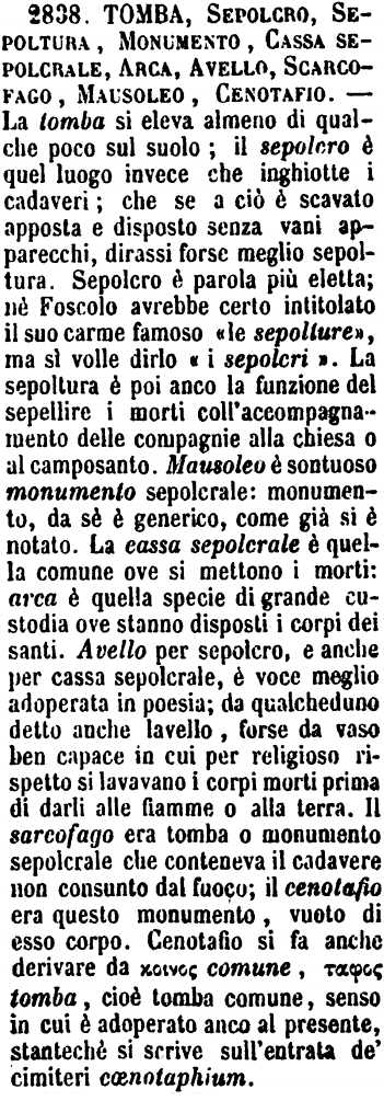 Tomba, Sepolcro, Sepoltura, Monumento, Cassa sepolcrale, Arca, Avello, Scarcofago, Mausoleo, Cenotafio - La tomba si eleva almeno di qualche poco sul suolo; il sepolcro è quel luogo invece che inghiotte i cadaveri; che se a ciò è scavato apposta e disposto senza vani apparecchi, dirassi forse meglio sepoltura. Sepolcro è parola più eletta; nè Foscolo avrebbe certo intitolato il suo carme famoso «le sepolture», ma sì volle dirlo «i sepolcri». La sepoltura è poi anco la funzione del sepellire i morti coll'accompagnamento delle compagnie alla chiesa o al camposanto. Mausoleo è sontuoso monumento sepolcrale: monumento, da sè è generico, come già si è notato. La cassa sepolcrale è quella comune ove si mettono i morti: arca è quella specie di grande custodia ove stanno disposti i corpi dei santi. Avello per sepolcro, e anche per cassa sepolcrale, è voce meglio adoperata in poesia; da qualcheduno detto anche lavello, forse da vaso ben capace in cui per religioso rispetto si lavavano i corpi morti prima di darli alle fiamme o alla terra. Il sarcofago era tomba o monumento sepolcrale che conteneva il cadavere non consunto dal fuoco; il cenotafio era questo monumento, vuoto di esso corpo. Cenotafio si fa anche derivare da χοινος comune, ταφος tomba, cioè tomba comune, senso in cui è adoperato anco al presente, stantechè si scrive sull'entrata de' cimiteri coenotaphium. [immagine]