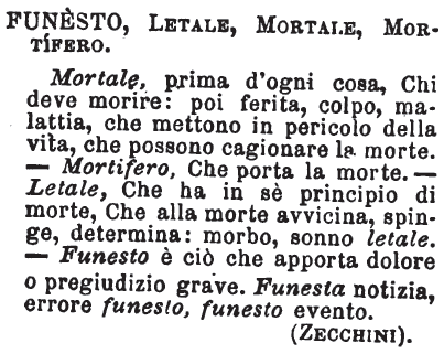 Funesto, Letale, Mortale, Mortifero - Mortale, prima d'ogni cosa, Chi deve morire: poi ferita, colpo, malattia, che mettono in pericolo della vita, che possono cagionare la morte. - Mortifero, Che porta la morte. - Letale, Che ha in sè principio di morte, Che alla morte avvicina, spinge, determina: morbo, sonno letale. - Funesto è ciò che apporta dolore o pregiudizio grave. Funesta notizia, errore funesto, funesto evento.(Zecchini). [immagine]