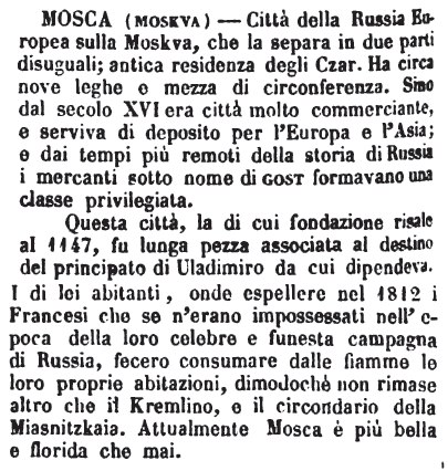 Questa città, la di cui fondazione risale al 1147, fu lunga pezza associata al destino del principato di Uladimiro da cui dipendeva. I di lei abitanti, onde espellere nel 1812 i Francesi che se n'erano impossessati nell'epoca della loro celebre e funesta campagna di Russia, fecero consumare dalle fiamme le loro proprie abitazioni, dimodochè non rimase altro che il Kremlino, e il circondario della Miasnitzkaia. Attualmente Mosca è più bella e florida che mai. [immagine]