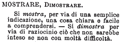 | Mostrare, Dimostrare - Si mostra, per via di una semplice indicazione, una cosa chiara e facile a comprendersi. - Si dimostra per via di raziocinio ciò che non sarebbe inteso se non con molta difficoltà. [immagine] |