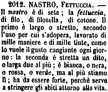 Nastro, Fettuccia - Il nastro è di seta; la fettuccia, di filo, di filosella, di cotone. Il primo è largo o stretto, secondo l'uso per cui s'adopera, lavorato di mille maniere e di mille tinte, come lo vuole il gusto cangiante ogni giorno: la seconda è stretta un dito, o larga due al più; è bianca, o nera, o rossa, o verde, ma al più stiamo lì; ha da essere forte, perchè serve a stringere gli abiti attorno alla vita. [immagine]