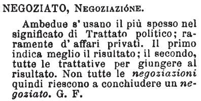 Negoziato, Negoziazione - Ambedue s'usano il più spesso nel significato di Trattato politico; raramente d'affari privati. Il primo indica meglio il risultato; il secondo, tutte le trattative per giungere al risultato. Non tutte le negoziazioni quindi riescono a conchiudere un negoziato. G. F. [immagine]