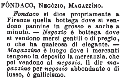 Fondaco, Negozio, Magazzino - Fondaco si dice propriamente a Firenze quella bottega dove si vendono pannine in grosso e anche a minuto. - Negozio è bottega dove si vendono merci gentili o di pregio, o che ha qualcosa di elegante. - Magazzino è luogo dove i mercanti tengono in deposito la mercanzia, che poi vendono al negozio. Il dir magazzino per negozio abbondante o di lusso, è gallicismo. [immagine]