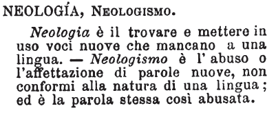 Neologia, Neologismo - Neologia è il trovare e mettere in uso voci nuove che mancano a una lingua. - Neologismo è l'abuso o l'affettazione di parole nuove, non conformi alla natura di una lingua; ed è la parola stessa così abusata. [immagine]