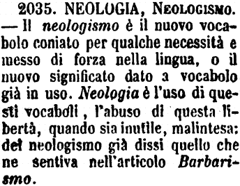 Neologia, Neologismo - Il neologismo è il nuovo vocabolo coniato per qualche necessità e messo di forza nella lingua, o il nuovo significato dato a vocabolo già in uso. Neologia è l'uso di questi vocaboli, l'abuso di questa libertà, quando sia inutile, malintesa: del neologismo già dissi quello che ne sentiva nell'articolo Barbarismo. [immagine]