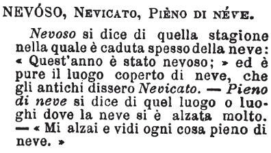 Nevoso, Nevicato, Pieno di neve - Nevoso si dice di quella stagione nella quale è caduta spesso della neve: «Quest'anno è stato nevoso;» ed è pure il luogo coperto di neve, che gli antichi dissero Nevicato. - Pieno di neve si dice di quel luogo o luoghi dove la neve si è alzata molto. - «Mi alzai e vidi ogni cosa pieno di neve.» [immagine]