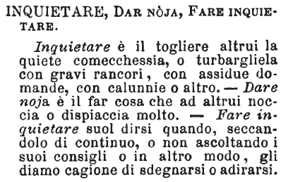 | Inquietare, Dar noja, Fare inquietare - Inquietare è il togliere altrui la quiete comecchessia, o turbargliela con gravi rancori, con assidue domande, con calunnie o altro. - Dare noja è il far cosa che ad altrui noccia o dispiaccia molto. - Fare inquietare suol dirsi quando, seccandolo di continuo, o non ascoltando i suoi consigli o in altro modo, gli diamo cagione di sdegnarsi o adirarsi. [immagine] |