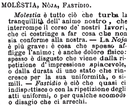 | Fastidio, Noja - Fastidio è tutto ciò che molesta attualmente e materialmente, e che ci studiamo, quanto è in noi, di rimuovere. - Noja è meno materiale, e può procedere, non da cose materiali, ma da condizioni morali, da disposizione di animo o da simili cagioni. Fastidio è cosa positiva, Noja è privazione di letizia. [immagine] |