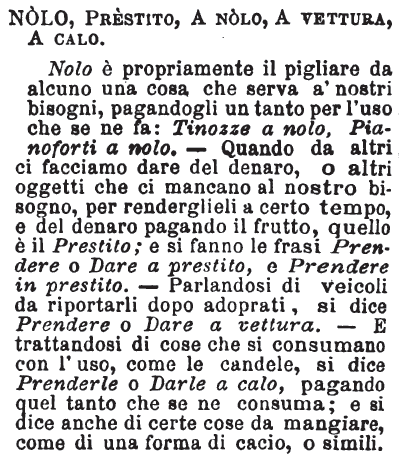 | Nolo, Prestito, A nolo, A vettura, A calo - Nolo è propriamente il pigliare da alcuno una cosa che serva a' nostri bisogni, pagandogli un tanto per l'uso che se ne fa: Tinozze a nolo, Pianoforti a nolo. - Quando da altri ci facciamo dare del denaro, o altri oggetti che ci mancano al nostro bisogno, per renderglieli a certo tempo, e del denaro pagando il frutto, quello è il Prestito; e si fanno le frasi Prendere o Dare a prestito, e Prendere in prestito. - Parlandosi di veicoli da riportarli dopo adoprati, si dice Prendere o Dare a vettura. - E trattandosi di cose che si consumano con l'uso, come le candele, si dice Prenderle o Darle a calo, pagando quel tanto che se ne consuma; e si dice anche di certe cose da mangiare, come di una forma di cacio, o simili. [immagine] |