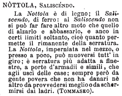 Nottola, Saliscendo - La Nottola è di legno; il Saliscendo, di ferro: al Saliscendo non si può far fare altro moto che quello di alzarlo e abbassarlo, e anco in certi limiti soltanto, cioè quanto permette il rimanente della serratura. La Nottola, imperniata nel mezzo, o presso a poco, può muoversi tutt'in giro; è serratura più adatta a finestre, a porte d'armadii e simili, che agli usci delle case; sempre però da gente povera che non ha danari nè altro da provvedersi meglio o da schermirsi dai ladri. (Tommaseo). [immagine]
