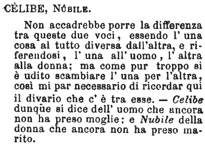 Celibe, Nubile - Non accadrebbe porre la differenza tra queste due voci, essendo l'una cosa al tutto diversa dall'altra, e riferendosi, l'una all'uomo, l'altra alla donna; ma come pur troppo si è udito scambiare l'una per l'altra, così mi par necessario di ricordar qui il divario che c'è tra esse. - Celibe dunque si dice dell'uomo che ancora non ha preso moglie; e Nubile della donna che ancora non ha preso marito. [immagine]