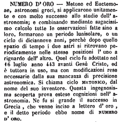 Numero d’oro - Metone ed Euctemoae, astronomi greci, si applicarono unitamente e con molto successo allo studio dell'astronomia; e combinando mediante sagacissimo calcolo tutte le osservazioni fatte sino a loro, formarono un periodo lunisolare, o un ciclo di diciannove anni, perchè dopo quello spazio di tempo i due astri si ritrovano periodicamente nelle stesse posizioni l'uno a riguardo dell'altro. Quel ciclo fu adottato nel 16 luglio anno 443 avanti Gesù Cristo, ed è tuttora in uso, ma con modificazioni rese necessarie dalla sua mancanza di precisione astronomica. Si chiama ciclo metonico, dal nome del suo inventore. Questa ingegnosissima scoperta prova estese cognizioni nell'astronomia. Ne fu si grande il successo in Grecia, che venne inciso a lettere d'oro, e il detto periodo ebbe nome di numero d'oro. [immagine]