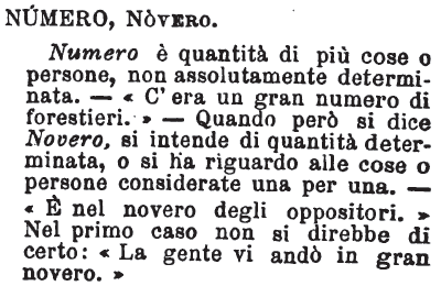 Numero, Novero - Numero è quantità di più cose o persone, non assolutamente determinata. - « C'era un gran numero di forestieri.» - Quando però si dice Novero, si intende di quantità determinata, o si ha riguardo alle cose o persone considerate una per una. - « E' nel novero degli oppositori.» Nel primo caso non si direbbe di certo: « La gente vi andò in gran novero.» [immagine]