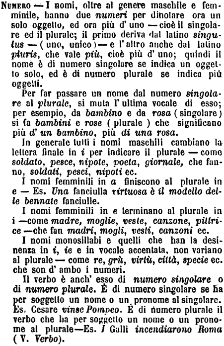 Numero - I nomi, oltre al genere maschile e femminile, hanno due numeri per dinotare ora un solo oggetto, ed ora più d'uno - cioè il singolare ed il plurale; il primo deriva dal latino singulus - (uno, unico) - e l'altro anche dal latino pluris che vale più, cioè più d'uno; quindi il nome è di numero singolare se indica un oggetto solo, ed è di numero plurale se indica più oggetti.