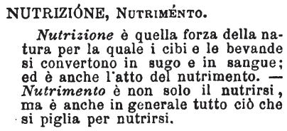 Nutrizione, Nutrimento - Nutrizione è quella forza della natura per la quale i cibi e le bevande si convertono in sugo e sangue; ed è anche l'atto del nutrimento. - Nutrimento è non solo il nutrirsi, ma è anche in generale tutto ciò che si piglia per nutrirsi. [immagine]